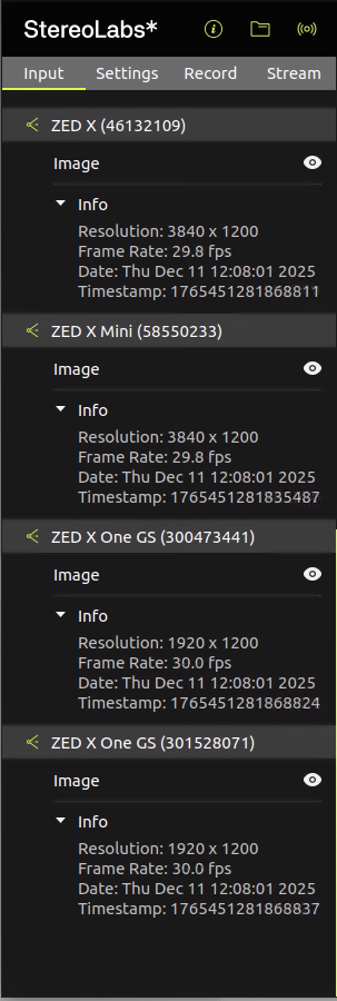 All the connected ZED cameras are listed in the left panel. You can select which cameras to visualize by opening or closing the eye icon below each camera serial number.