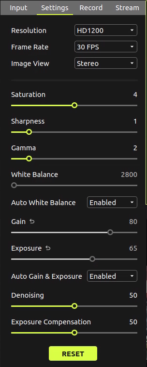 Click the RESET button to reset the camera parameters to their default values.