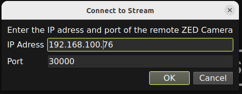 You can connect to a ZED Local Network Stream by entering the server IP address and port number in the dialog window.