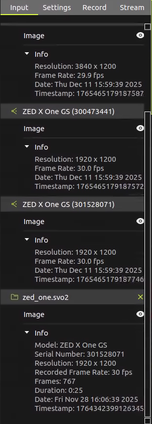 As with live streams, you can enable or disable the SVO stream visualization by clicking on the eye icon below each SVO file name in the left panel.